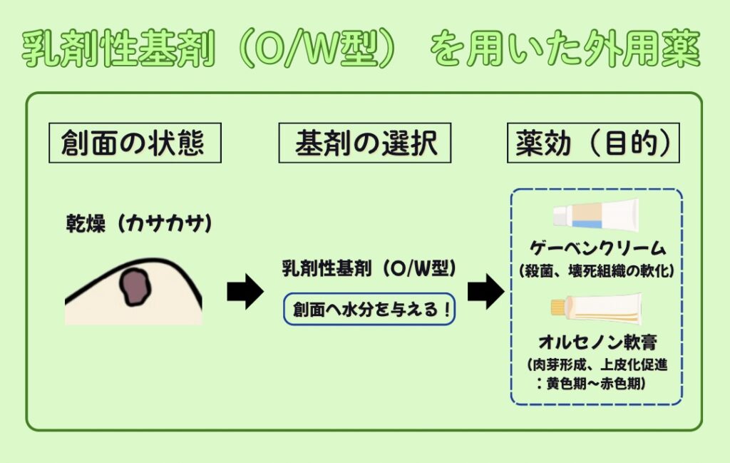乳剤性基剤(O/W型)は水分量が多いため、『過小な創面』に使用することが多いです!